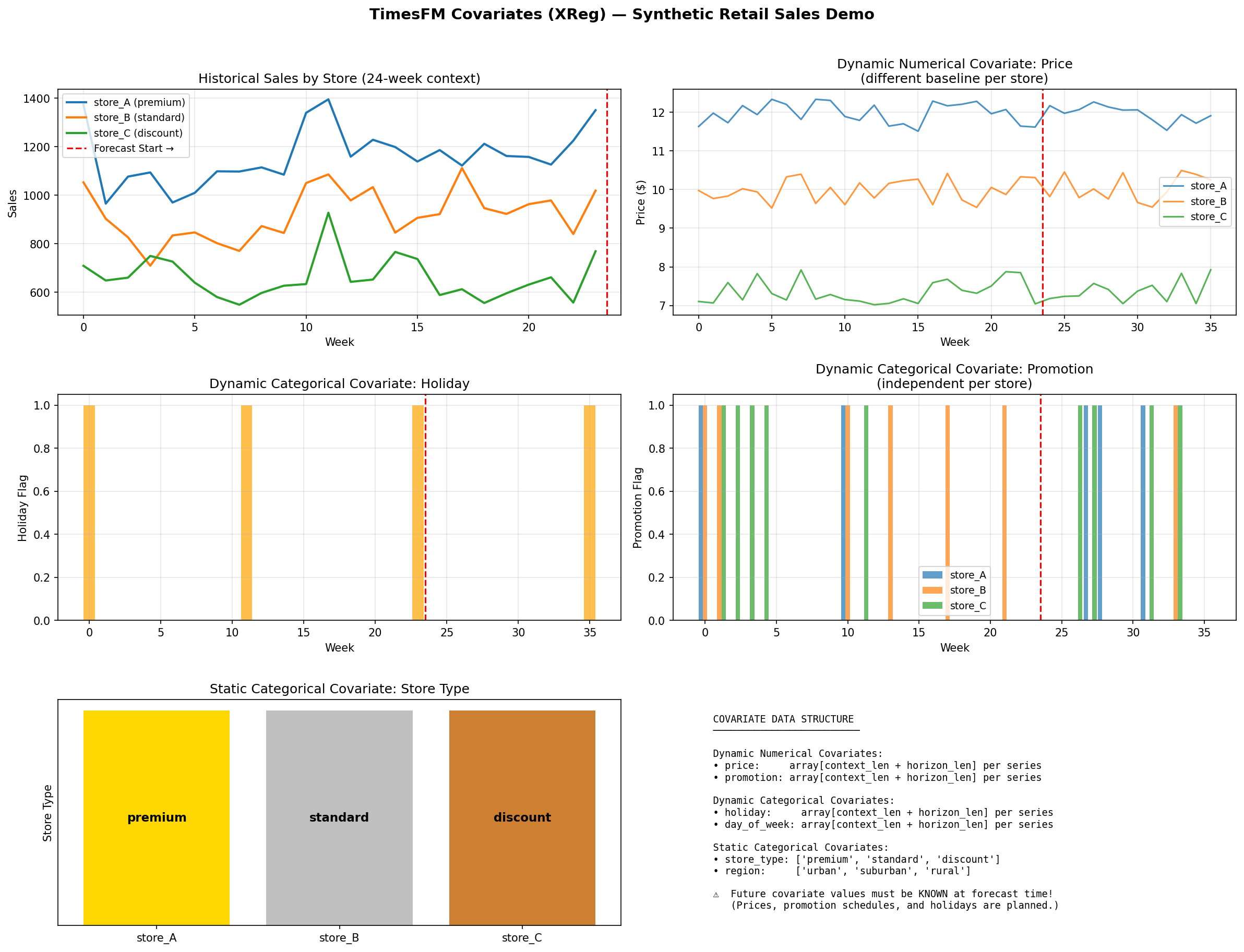 Anomaly detection fixes: - Fix critical quantile index bug: index 0 is mean not q10; correct indices are q10=1, q20=2, q80=8, q90=9 - Redesign test: use all 36 months as context, inject 3 synthetic anomalies into future - Result: 3 CRITICAL detected (was 11/12 — caused by test-set leakage + wrong indices) - Update severity labels: CRITICAL = outside 80% PI, WARNING = outside 60% PI Covariates fixes: - Fix variable-shadowing bug: inner dict comprehension overwrote outer loop store_id causing all stores to get identical covariate arrays (store_A's price for everyone) - Give each store a distinct price baseline (premium $12, standard $10, discount $7.50) - Trim CONTEXT_LEN from 48 → 24 weeks; CSV now 108 rows (was 180) - Add NOTE ON REAL DATA comment: temp file pattern for large external datasets Both scripts regenerated with clean outputs.